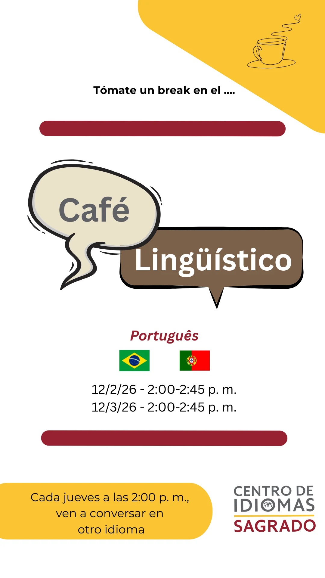 Café lingüístico – Portugués Te invitamos al Centro de Idiomas y conversar en portugués 12 Mar 2:00 pm - 2:45 pm Centro de Idiomas (SJ 201)