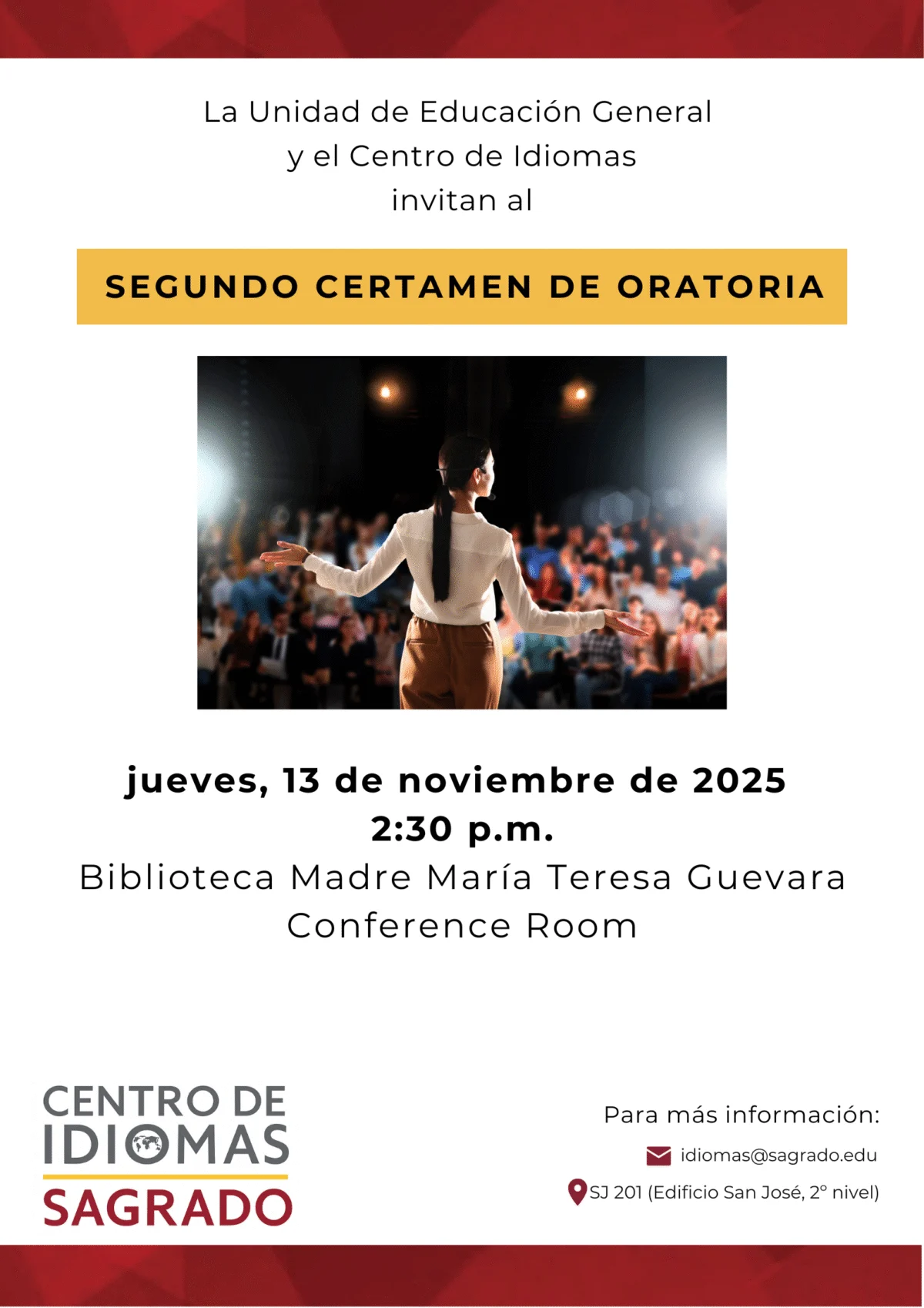 Inicio Eventos - Eventos@Sagrado Académico 2do Certamen de Oratoria Localización Sala de Conferencias Biblioteca Madre María Teresa Guevara Categoría Académico Fecha Nov 13 2025 ¡Finalizado! Hora 2:30 pm 2do Certamen de Oratoria La Unidad de Educación General y el Centro de Idiomas te invitan al Segundo Certamen de Oratoria Compartir este evento + Añadir Google Calendar Exportación + iCal / Outlook