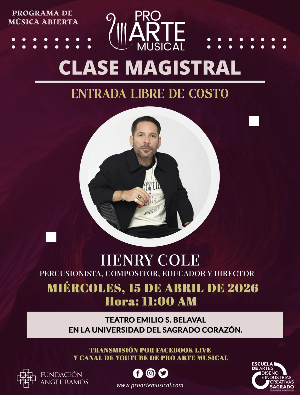 El Programa Música Abierta de Pro Arte Musical presenta una clase magistral con el percusionista, compositor, educador y director Henry Cole, abierta a la comunidad.
