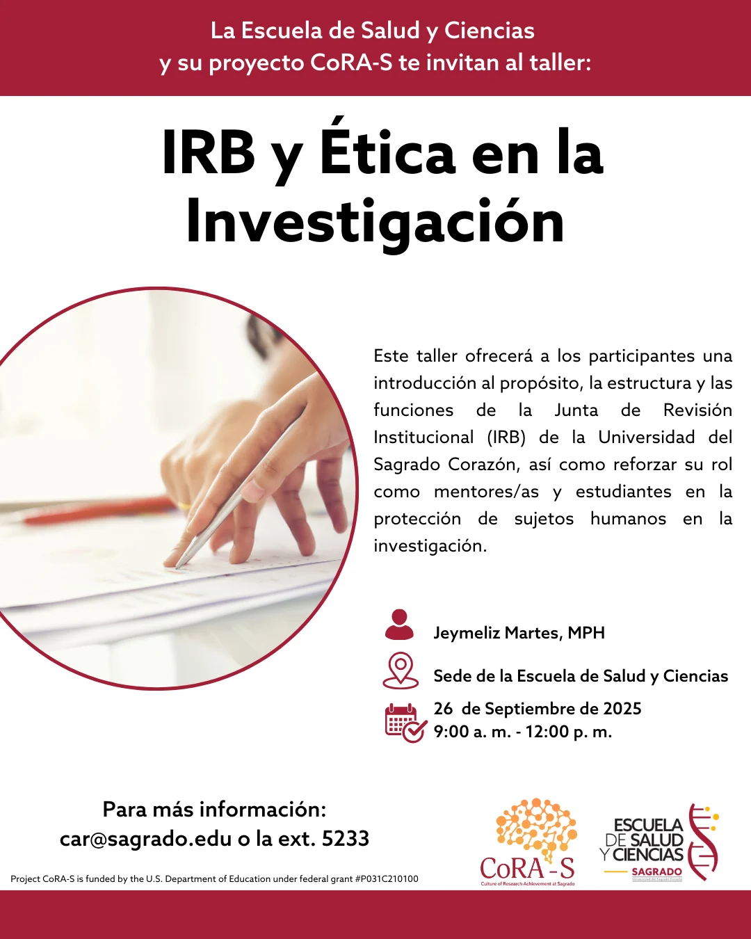 El taller ofrecerá una introducción al propósito, estructura y funciones de la Junta de Revisión Institucional (IRB) de Sagrado así como reforzar su rol como mentores/as y estudiantes en la protección de sujetos humanos en la investigación